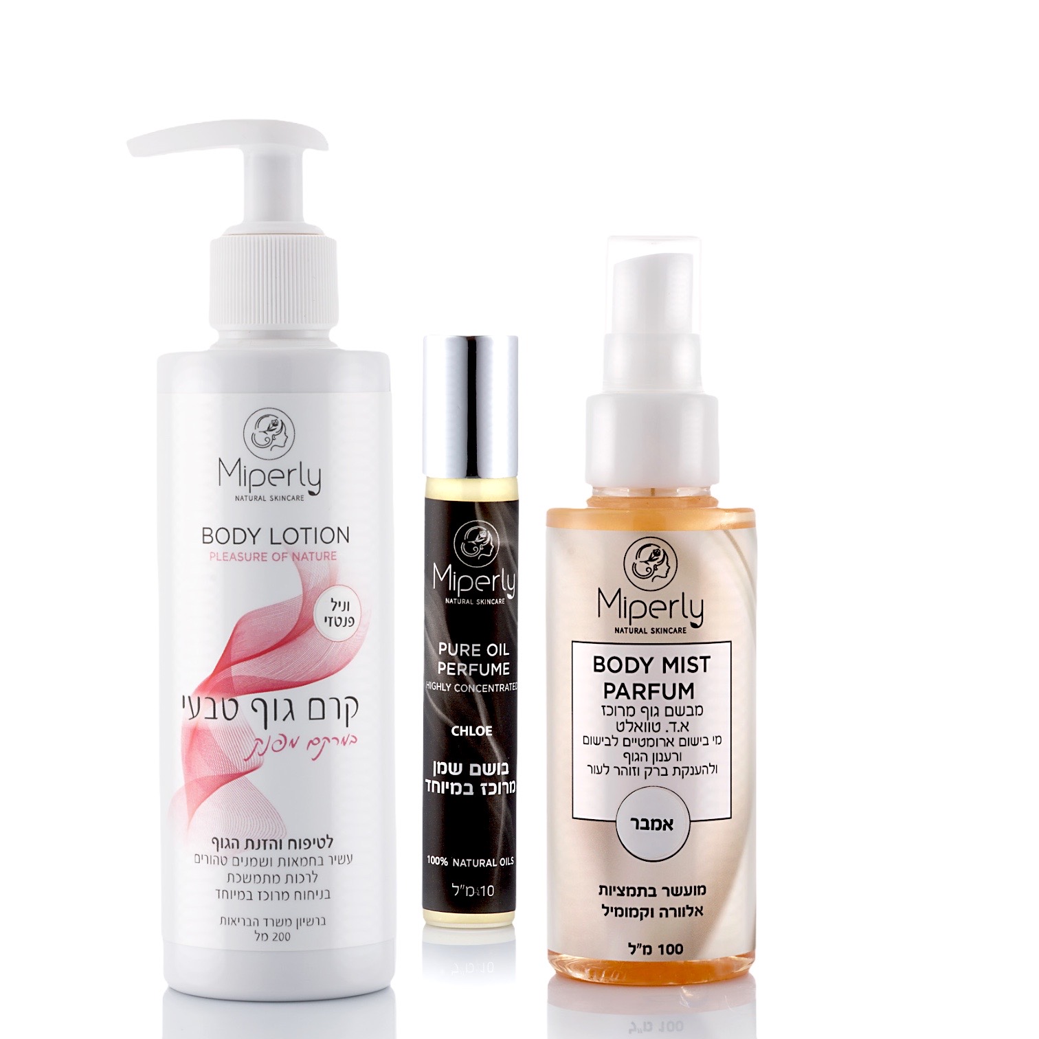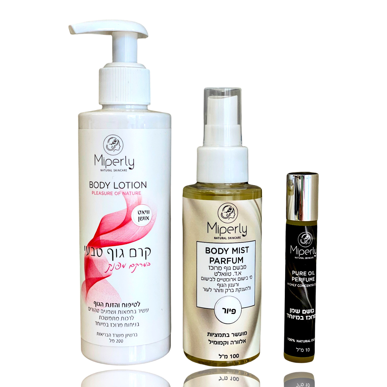 מארז מוצרי טיפוח ובישום מפנק מבשם גוף טבעי + קרם גוף + בושם רולר טבעי • מבשם גוף - body mist - מי בישום ארומטיים לרענון ובישום הגוף, להחדרת לחות, להשריית ניחוח מפנק לאורך זמן , מועשרים בתמציות אלוורה וקמומיל. ותמצית בושם טבעית חזקה במיוחד.
