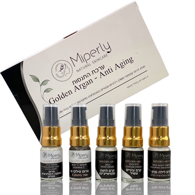{tab title="תאור מוצר "}ערכת טיפוח אנטיאייגינג להתנסות בסדרת גולדן ארגן מכילה 5 מוצרים בגודל מיוחד :1. סרום פנים - 60% חומצה היאלורנית וקולגן - למיצוק ושיקום העור מכיל 2 סוגי חומצה היאלורונית במולקולות שונות לשילוב אנטיאייגינג פעיל.